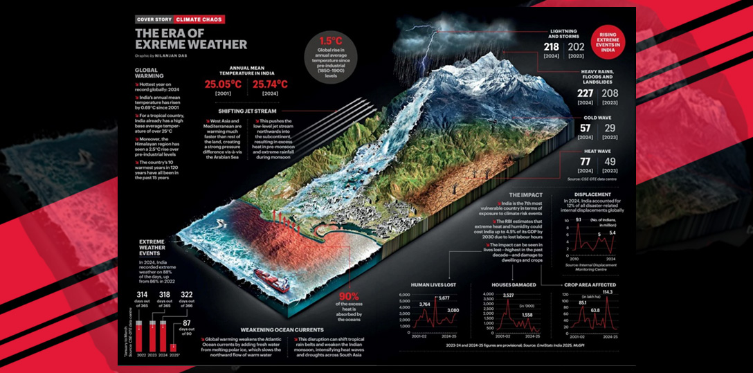 The global climate crisis is accelerating, with far-reaching implications for businesses, economies and communities. 2024 marks the first year in recorded history where average global temperatures exceeded 1.5°C – a critical threshold that amplifies extreme weather events and disrupts established climate patterns. Over the past 50 years, incidences of heavy rainfall days and cloud bursts have increased by 75% in certain regions, leading to devastating floods such as those in Himachal Pradesh & Punjab in 2023, which caused damages > ₹8,000 crore. At the same time, rising temperatures have intensified heatwaves, with heat indices reaching as high as 55°C in parts of Gujarat & Rajasthan, resulting in productivity losses and surging cooling demands.
